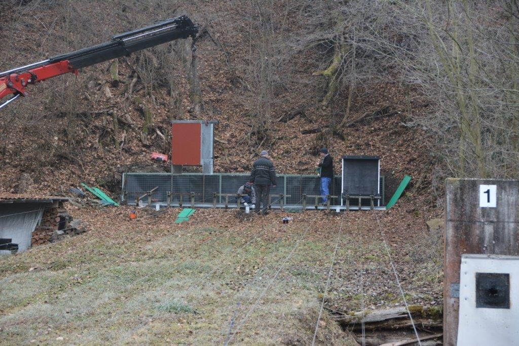 Ab 8.15 Uhr erwartete der Präsident die Mannschaft. 9.15 Uhr war dann die Ankunft. Die Einfahrt ins Schiessgelände erwies sich als äusserst heikel, es hatte keine 3 cm Luft links und rechts zu Torpfosten und Dachkante. Bald war der LKW am gewünschten Ort und die Stützen ausgefahren. Gut ausgerüstet, richteten die Mannen den Bauplatz, einige Brauen auf dem Betonfundament mussten noch weggespitzt werden und schon konnten die Sockelschienen verlegt werden.