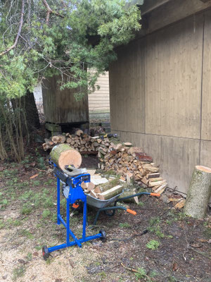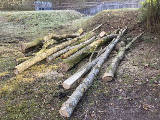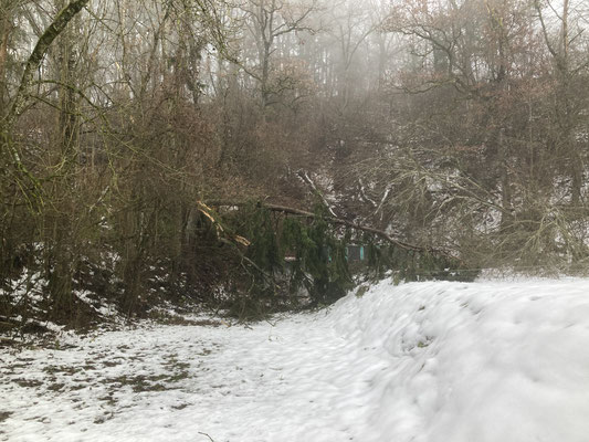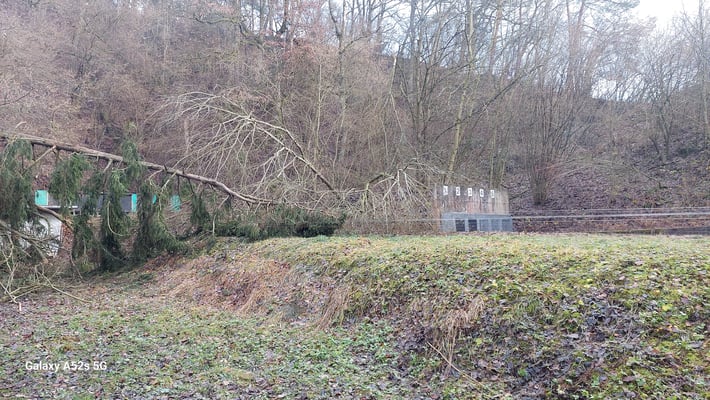 Im Dezember 23 drückte eine schwere Schneelast diverse Bäume an der steilen Halde und im Standareal um. Auch wurden diverse Äste der stolzen Föhre abgebrochen. Es aus wie nach einem Bombenangriff. Bäume kreuz und quer und über die 50m Drähte. Wir waren zuerst ratlos. Nach Beratungen und einigen Telefonaten mit der Gemeinde konnte eine für alle gute Lösung gefunden werden. Hier muss ich ein ganz dickes Lob und Dank aussprechen: Hucki und Stefan, die Gemeinde Schleitheim mit ihrem Förster Christophe Gasser, Hubert und Joachim von den Vorderladern haben ganze Sache gemacht. Um dem schweren Gerät des Forstdienstes Platz zu machen musste der Zaun entfernt werden, Alles wurde mit Tempo entfernt oder zum Spalten aufgerüstet. An einem Samstag war Spalten und Beigen angesagt. Das Resultat lässt sich sehen. Hucki und Stefan haben noch einige Planierarbeiten im Sinn, dann kann der Zaun wieder aufgestellt werden. Die Gemeinde verzichtet auf Rechnungsstellung und Willi Brunschwiler hat die Föhre für 350.- gefällt und abtransportiert. So sind unsere Kassenwarte mit einem blauen Auge davon gekommen.